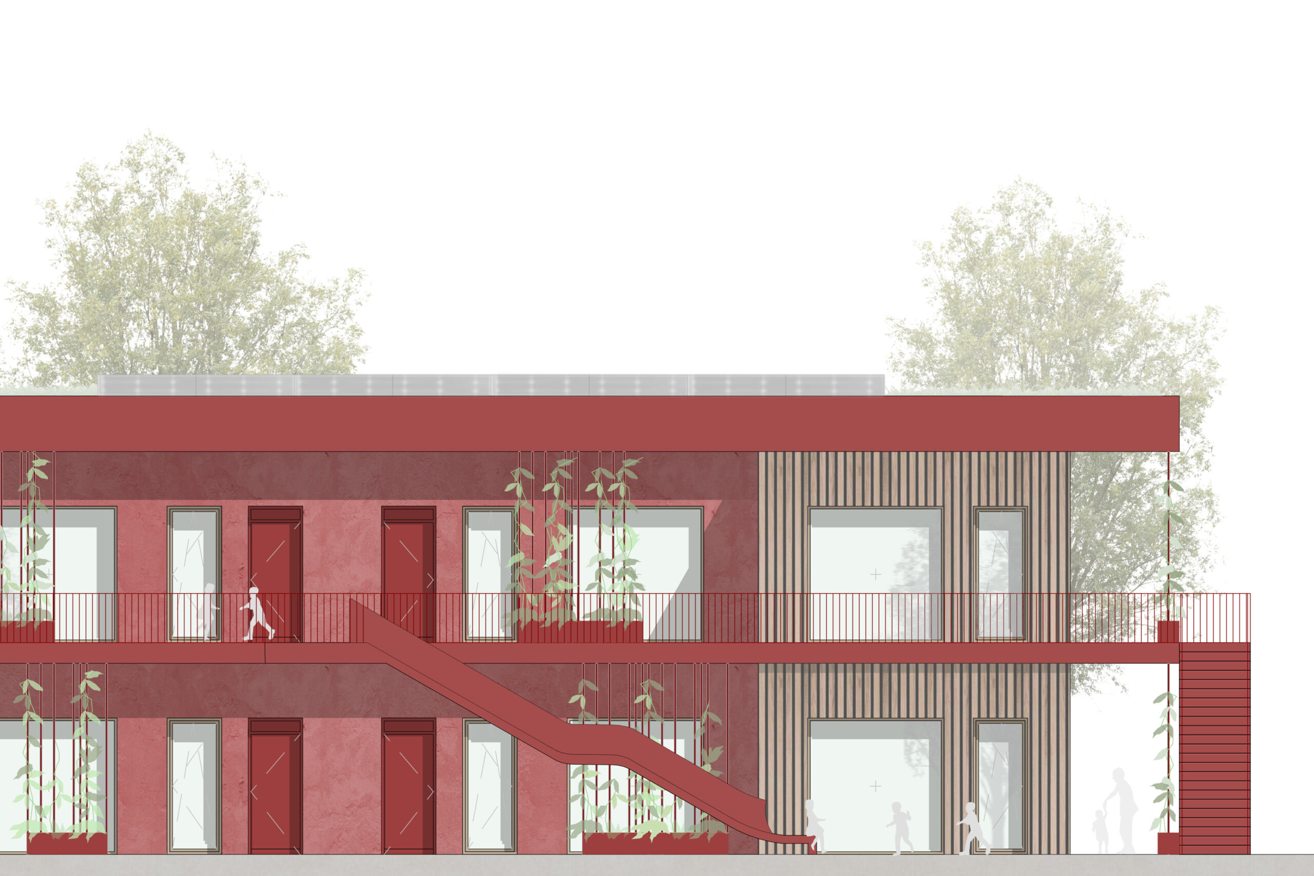 Für den Wohnungsbau sind rund 6.610 m² Geschossfläche geplant (ca. +3.500 m² gegenüber dem Bestand); 30 % der gesamten Wohnfläche sollen öffentlich gefördert entstehen. Die zweigeschossige Kita (ca. 1.100 m²) wirkt über das Gebiet hinaus für Merkenich. Stellplätze werden in einer Tiefgarage untergebracht, ergänzt durch eine grüne Mitte und fußläufige Wegeverbindungen.